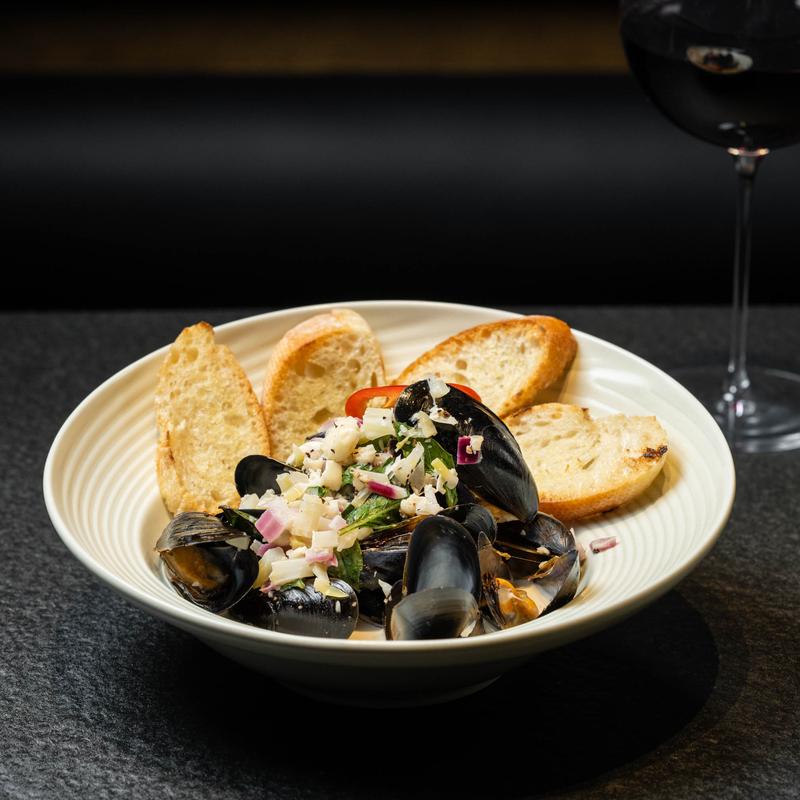 Mussels braised in white wine, served with bread