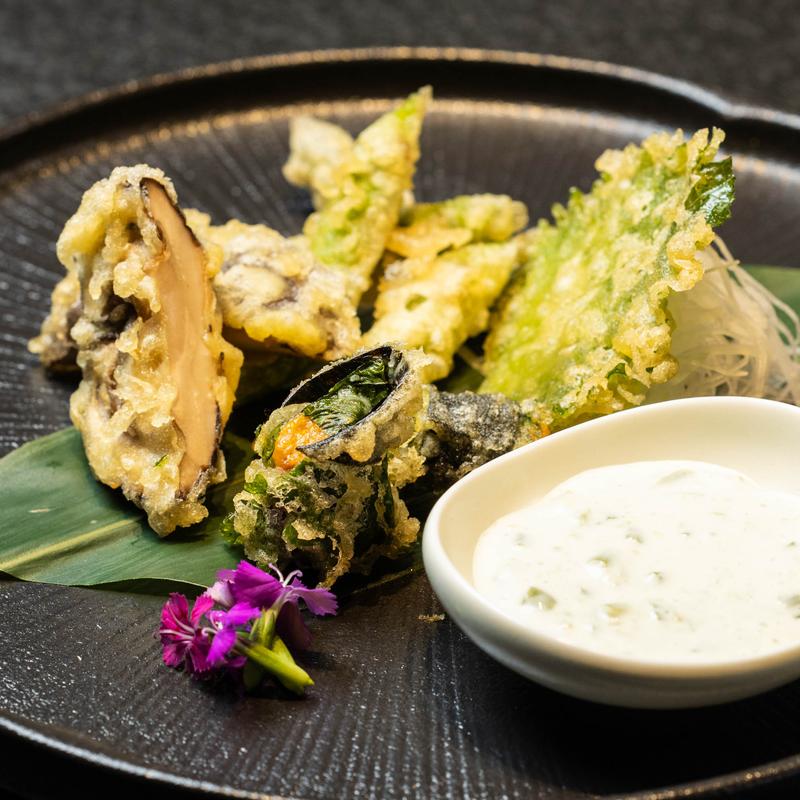 Shiitake mushroom, shiso leaf, asparagus, sea urchin, wasabi mayo