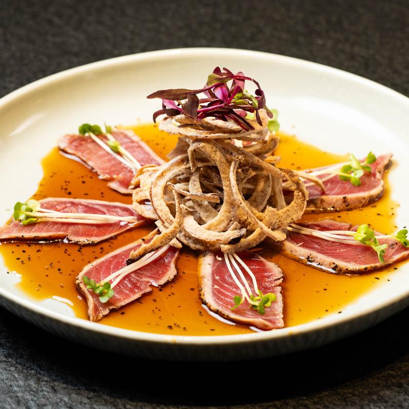 Pepper tuna, kaiware (baby radish sprouts), fried onion, tosazu sauce (soy, vinegar, bonito flakes)