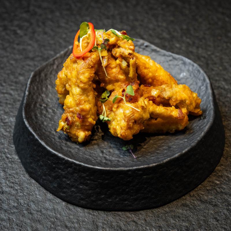 Crispy soft-shell crab, coated with egg yolk powder and curry powder