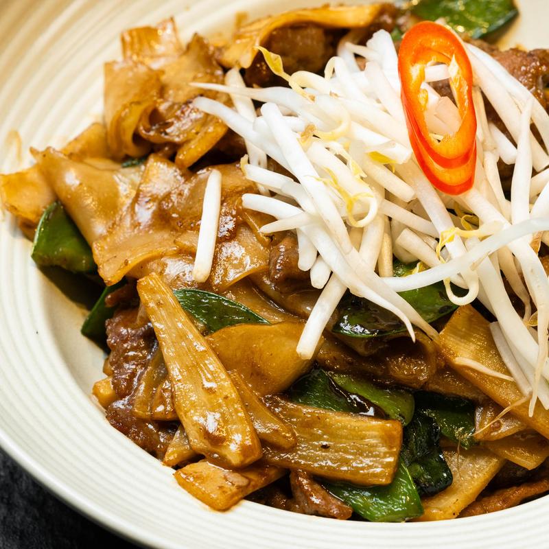Snow peas, Thai basil, king oyster mushroom, bamboo shoot, beef