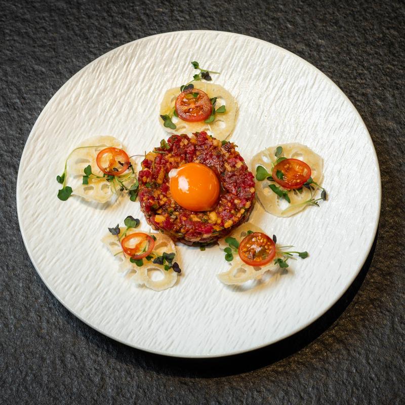 Raw beef, pear, pasteurized yolk, and house sauce