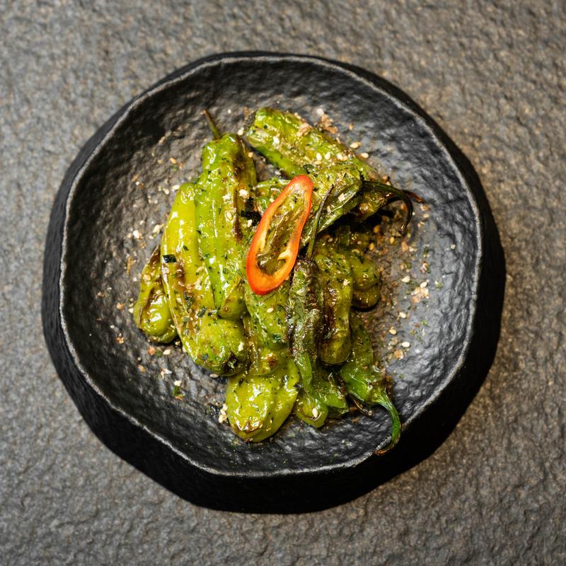 Charred shishito peppers, finished with dried fish flakes and shredded nori
