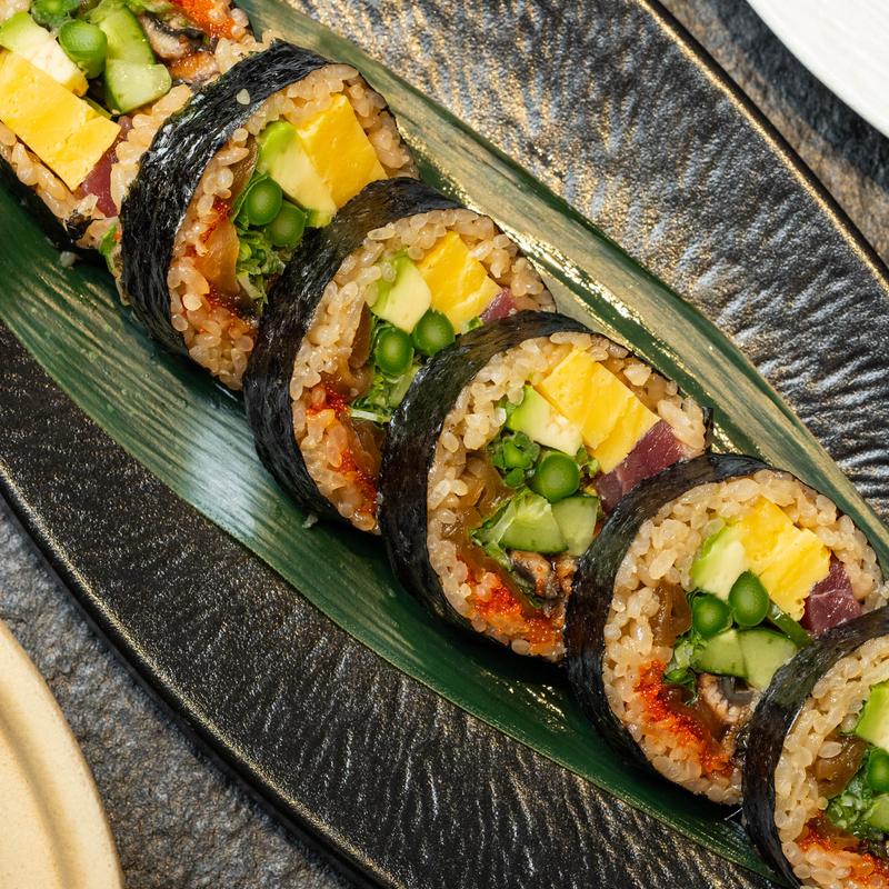 Kanpyo(dried gourd strips), avocado, cucumber, asparagus, masago, tamago, scallion, chili pepper, tuna, eel